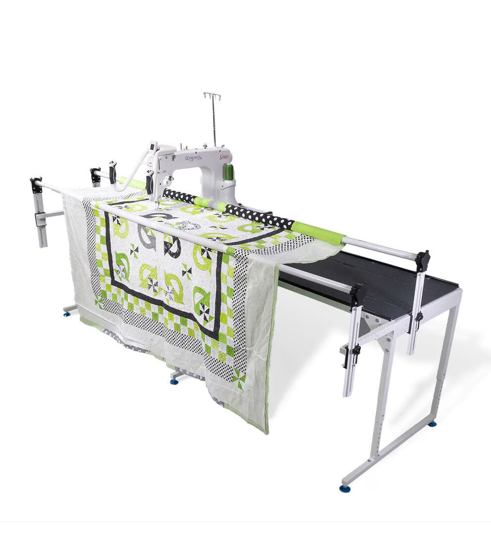 Get all the high-end quilting features packed into The Grace Company Q’nique 15R Mid-arm Quilting Machine & Frame. This quilting machine and frame offers superior stitching quality. The stitch regulation keeps your beautiful stitches consistently the same length. As you speed up or slow down in your movements, the machine will speed up and slow down its stitching speed. You don’t have to worry about some stitches being longer or shorter than others. This machine features six quick-access handle buttons, a full-color OLED screen, built-in bobbin winder, an easy-access bobbin and a large M-class bobbin. The Q-Zone Queen Frame sets up in queen or crib size. It is a no-baste two-rail system designed to make your quilting projects easier and more convenient. The frame features a smooth gliding track system for easy and precise machine movements. It also has height-adjustable legs, and includes quilt clips for easy fabric loading and tension control. New quilters are delighted to find how much easier quilting is with this quilting frame. Moving the machine to stitch is like drawing with a pencil on paper, not moving the paper underneath a stationary pencil.